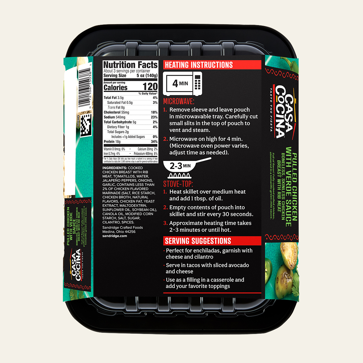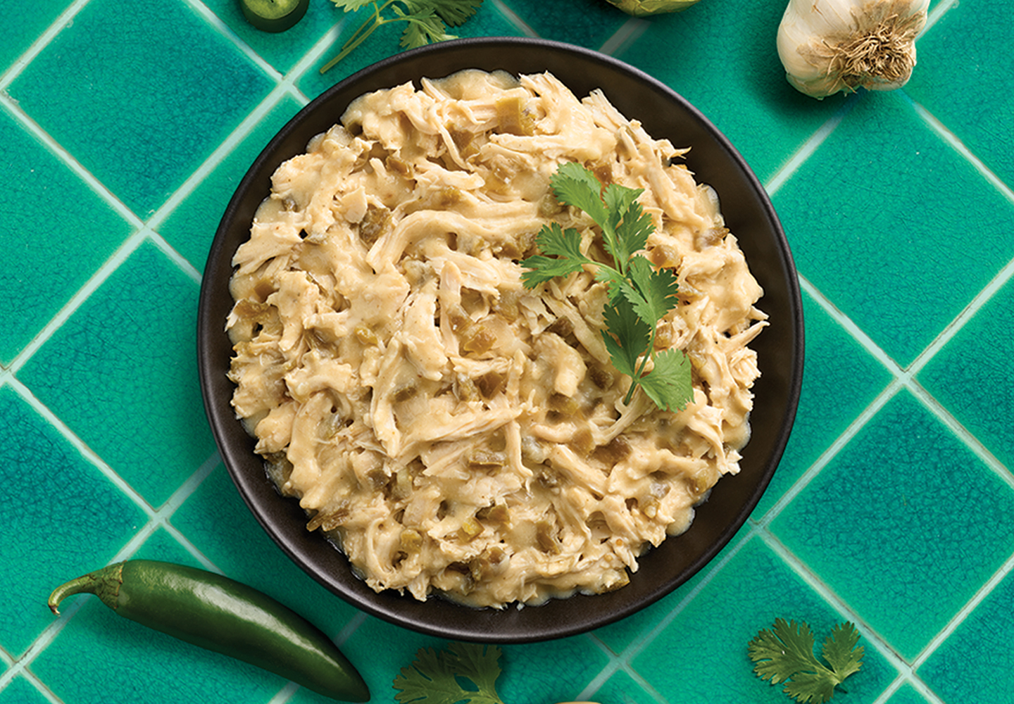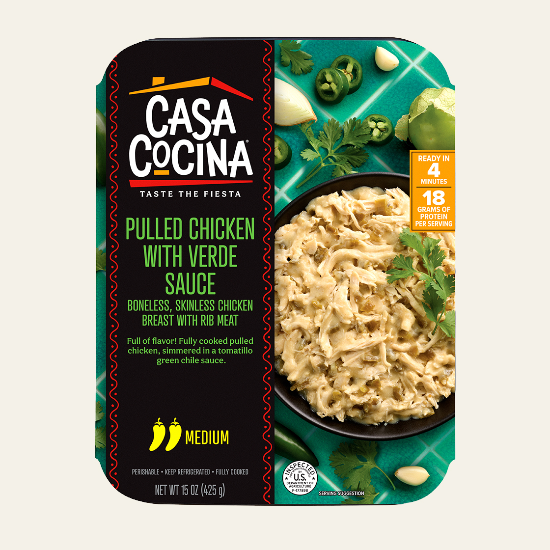 COOKED CHICKEN BREAST WITH RIB MEAT, TOMATILLOS, WATER, JALAPEÑO PEPPERS, ONIONS, GARLIC, CONTAINS LESS THAN 2% OF CHICKEN FLAVORED MARINADE (SALT, RICE STARCH, CHICKEN BROTH, NATURAL FLAVORS, CHICKEN FAT, YEAST EXTRACT, MALTODEXTRIN, SUNFLOWER OIL, SOYBEAN OIL), CANOLA OIL, MODIFIED CORN STARCH, SALT, SUGAR, CILANTRO, SPICES.
