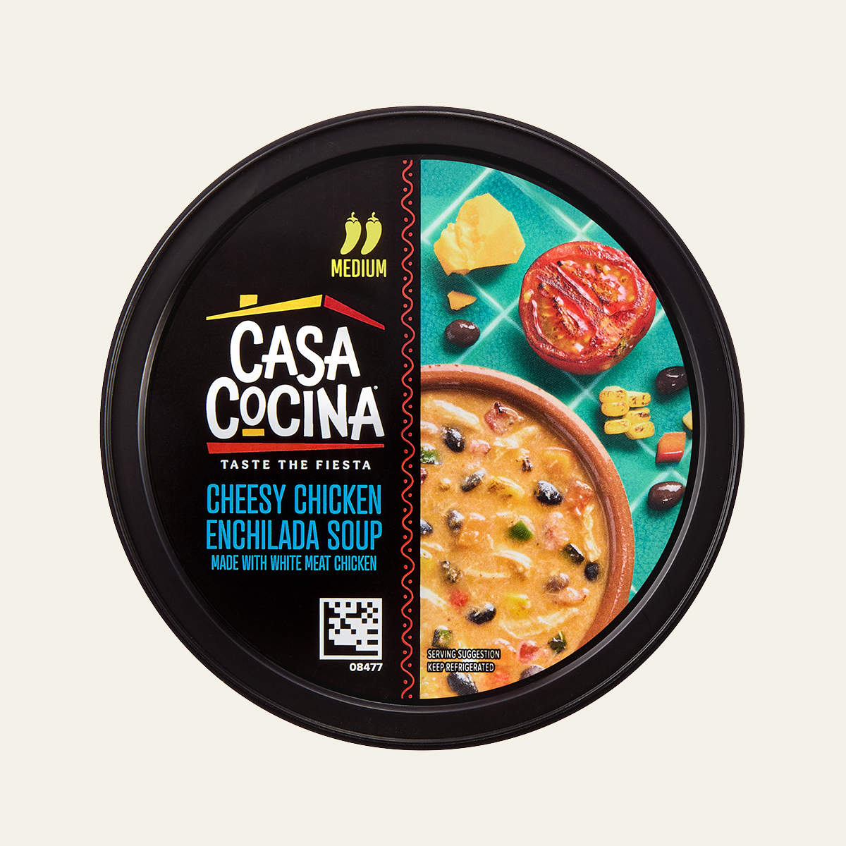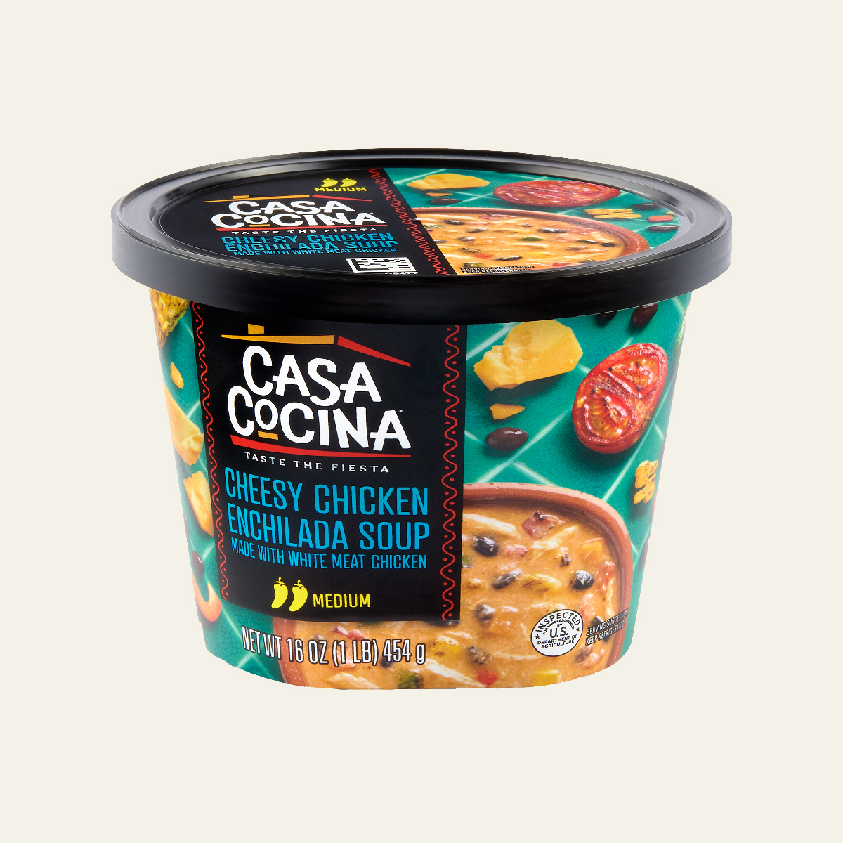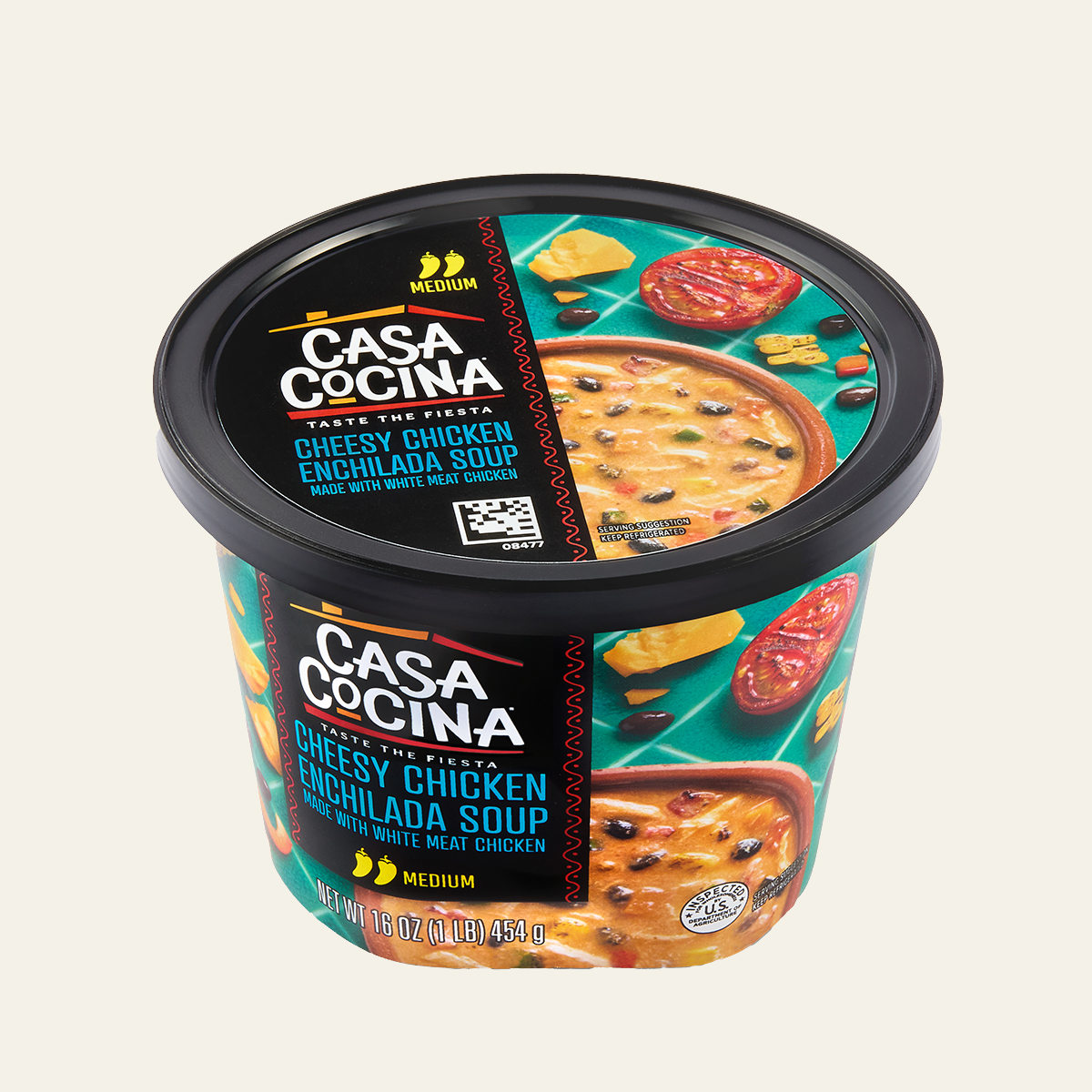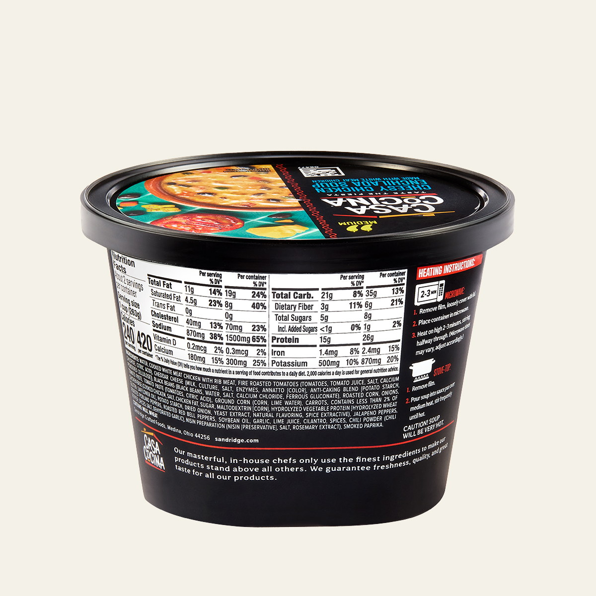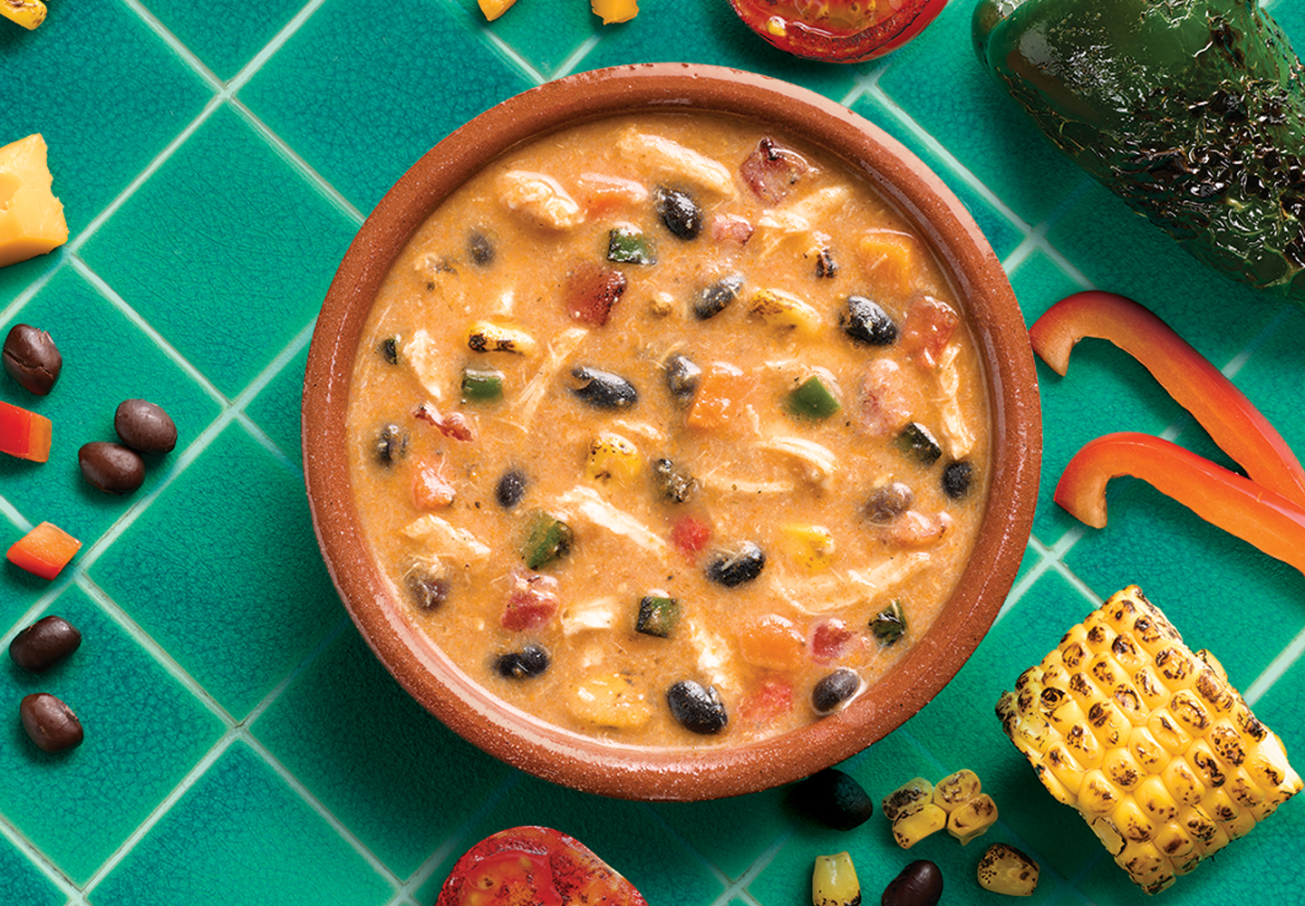 WATER, COOKED WHITE MEAT CHICKEN WITH RIB MEAT, FIRE ROASTED TOMATOES (TOMATOES, TOMATO JUICE, SALT, CALCIUM CHLORIDE, CITRIC ACID), CHEDDAR CHEESE (MILK, CULTURE, SALT, ENZYMES, ANNATTO [COLOR], ANTI-CAKING BLEND [POTATO STARCH, POWDERED CELLULOSE]), BLACK BEANS (BLACK BEANS, WATER, SALT, CALCIUM CHLORIDE, FERROUS GLUCONATE), ROASTED CORN, ONIONS, TOMATO PASTE, TOMATO PASTE (TOMATOES, CITRIC ACID), GROUND CORN (CORN, LIME WATER), CARROTS, CONTAINS LESS THAN 2% OF CHICKEN BASE (COOKED CHICKEN, SALT, CHICKEN FAT, SUGAR, MALTODEXTRIN [CORN], HYDROLYZED VEGETABLE PROTEIN [HYDROLYZED WHEAT GLUTEN, SAFFLOWER OIL], POTATO STARCH, DRIED ONION, YEAST EXTRACT, NATURAL FLAVORING, SPICE EXTRACTIVE), JALAPENO PEPPERS, ROASTED POBLANO PEPPERS, ROASTED RED BELL PEPPERS, SOYBEAN OIL, GARLIC, LIME JUICE, CILANTRO, SPICES, CHILI POWDER (CHILI PEPPER, SPICES, SALT, DEHYDRATED GARLIC), NISIN PREPARATION (NISIN [PRESERVATIVE], SALT, ROSEMARY EXTRACT), SMOKED PAPRIKA.