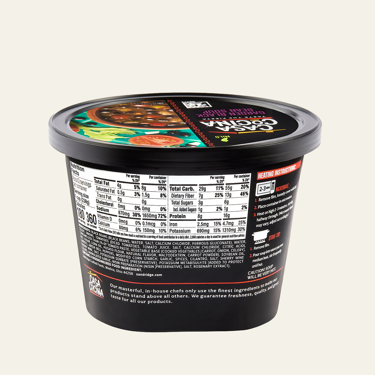 BLACK BEANS (BLACK BEANS, WATER, SALT, CALCIUM CHLORIDE, FERROUS GLUCONATE), WATER, CELERY, ONIONS, TOMATOES (DICED TOMATOES, TOMATO JUICE, SALT, CALCIUM CHLORIDE, CITRIC ACID), CONTAINS LESS THAN 2% OF TOMATO PASTE, VEGETABLE BASE (COOKED VEGETABLES [CARROT, ONION, CELERY], SALT, SUGAR, CORN OIL, POTATO FLOUR, NATURAL FLAVOR, MALTODEXTRIN, CARROT POWDER), SOYBEAN OIL, CARROTS, GREEN BELL PEPPERS, MODIFIED CORN STARCH, GARLIC, SPICES, CILANTRO, SALT, SHERRY WINE (SHERRY WINE, SALT, POTASSIUM SORBATE [PRESERVATIVE], POTASSIUM METABISULFITE [ADDED TO PROTECT COLOR]), GRANULATED GARLIC, NISIN PREPARATION (NISIN [PRESERVATIVE], SALT, ROSEMARY EXTRACT).